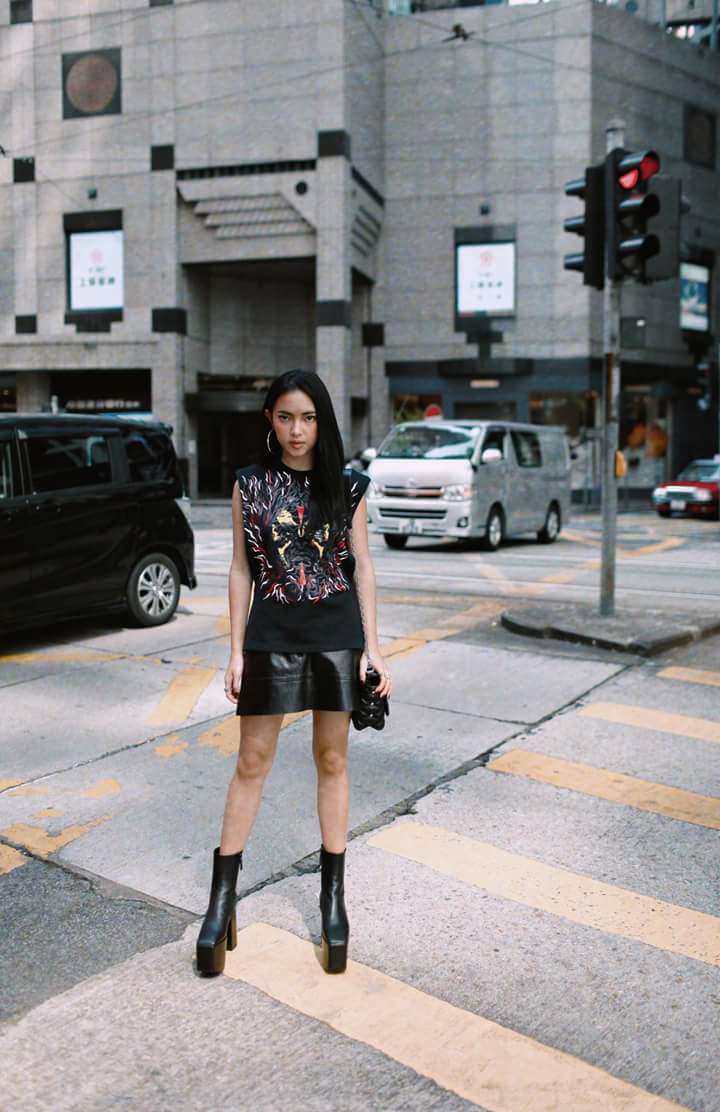 Không hề tỏ ra kém cạnh, Châu Bùi đem đến outfit allblack với áo phông họa tiết đi cùng chân váy da. Đặc biệt, đôi giày boots cổ cao với chiều cao “khủng” mà cô nàng đang sử dụng cũng giúp tăng điểm chất “ngầu” cho trang phục.