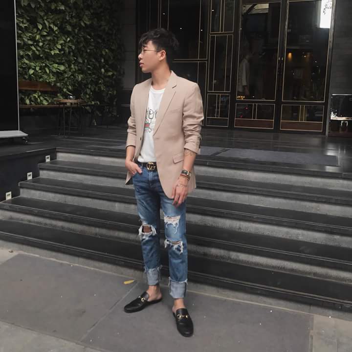 Stylist Hoàng Ku lại đem đến outfit kết hợp giữa áo vest màu beige thanh lịch, phối layer kèm áo thun và jeans rách xắn gấu cho buổi tiết trời giao mùa tạo nên tổng thể khá thú vị.