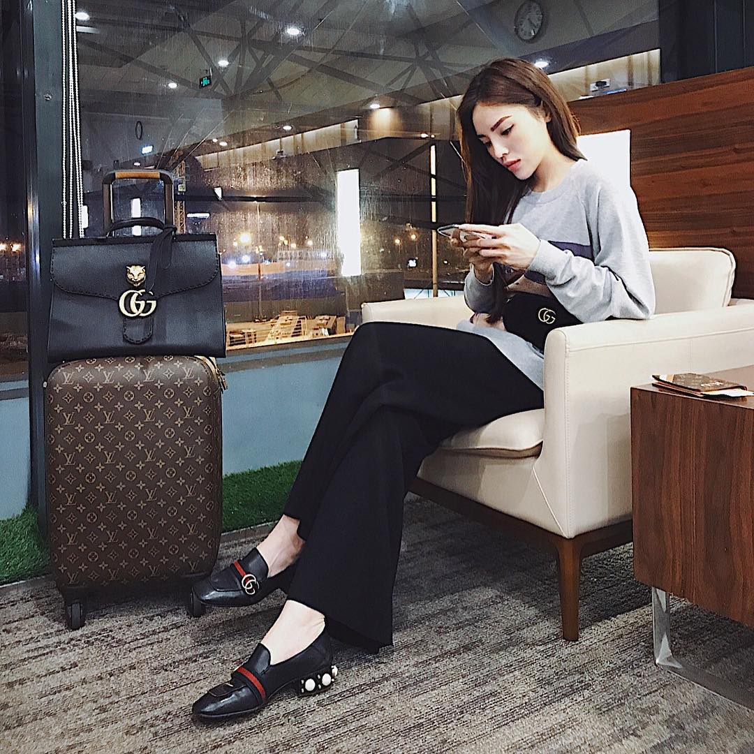 Diện áo swater tông xám cùng quần culottes đơn giản, nhưng trông Kỳ Duyên vẫn không hề “giản đơn” với sự xuất hiện của cả cây hàng hiệu, clutch, giày của Gucci, còn vali thuộc nhà mốt Louis Vuitton.