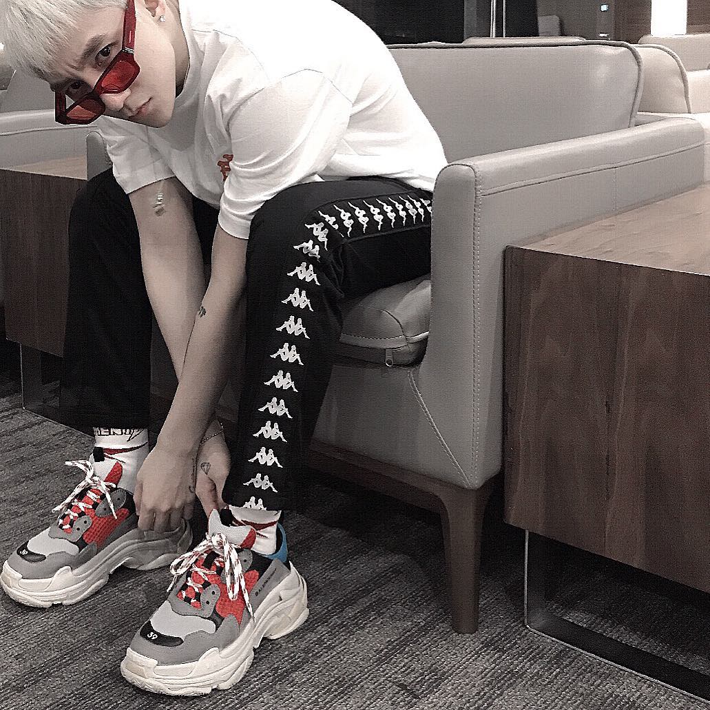 Không ai có thể phủ nhận độ “chất chơi” của Sơn tùng khi chỉ cần diện áo thun trắng basic, quần Kappa, đi kèm đôi giày Balenciaga Triple S màu sắc ăn rơ với kính mát.