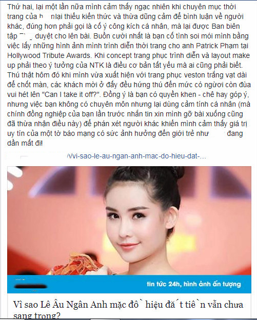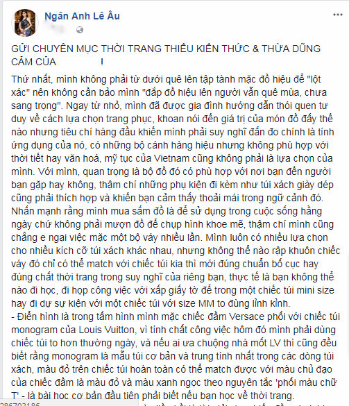 Trước hết Ngân Anh khẳng định cô không phải “gái quê” mới tập tành “chơi” đồ hiệu nên việc bảo cô đắp đồ hiệu nhưng vẫn chưa sang khiến cô không đồng tình.