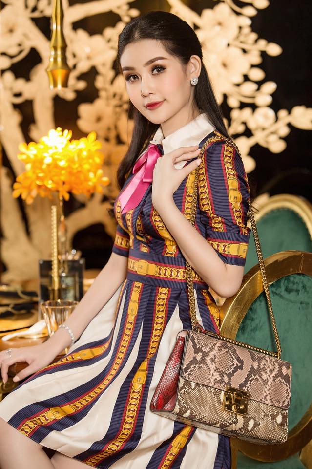 Người đẹp 22 tuổi hướng đến hình ảnh chững chạc, trưởng thành và “sang chảnh” với những phụ kiện hàng hiệu đắt tiền từ đồng hồ, túi xách, giày cao gót.
