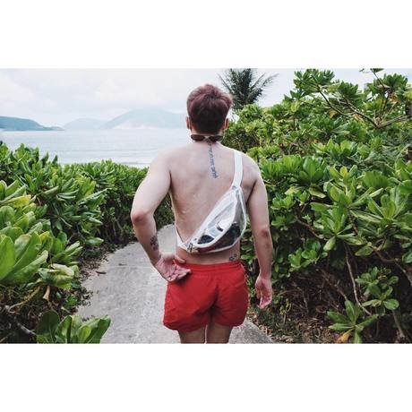 Stylist Hoàng Ku lại có một chiếc fanny back bằng chất liệu PVC không thấm nước cực xinh cho những chuyến du lịch, đi biển ngày hè.