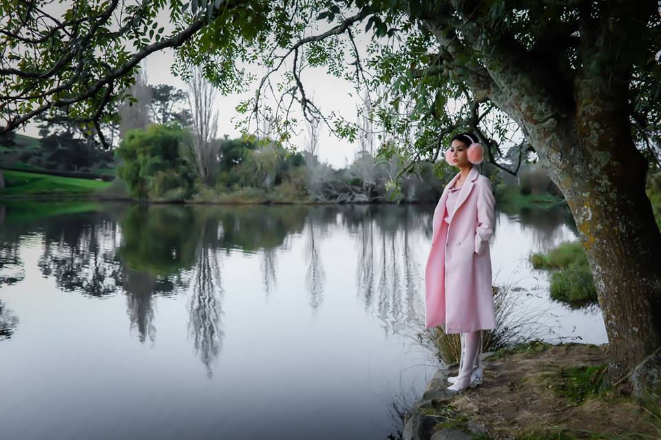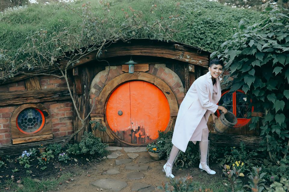 Trong ngày thứ 2 tại New Zealand, H'Hen Niê khoe street style có phần thanh lịch với cả cây áo măng tô cùng chân váy sáng màu.