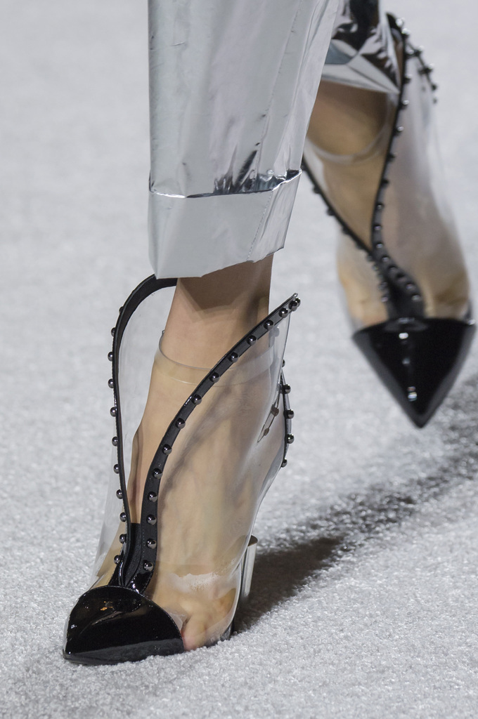 Balmain cũng giới thiệu một vài mẫu giày dép trong suốt kết hợp cùng chất liệu da bóng tại show diễn Thu, Đông 2018.