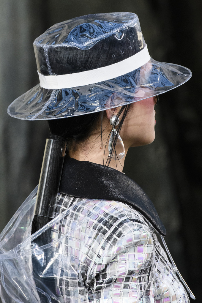 Chanel là một trong những thương hiệu tích cực “lăng xê” loạt phụ kiện trong suốt. Trong BST Xuân, Hè 2018, nhà mốt trình làng nhiều thiết kế từ nhựa PVC như boots, túi xách, găng tay, mũ… Đơn cử như kiểu mũ rộng vành có giá bán gần 27 triệu đồng.