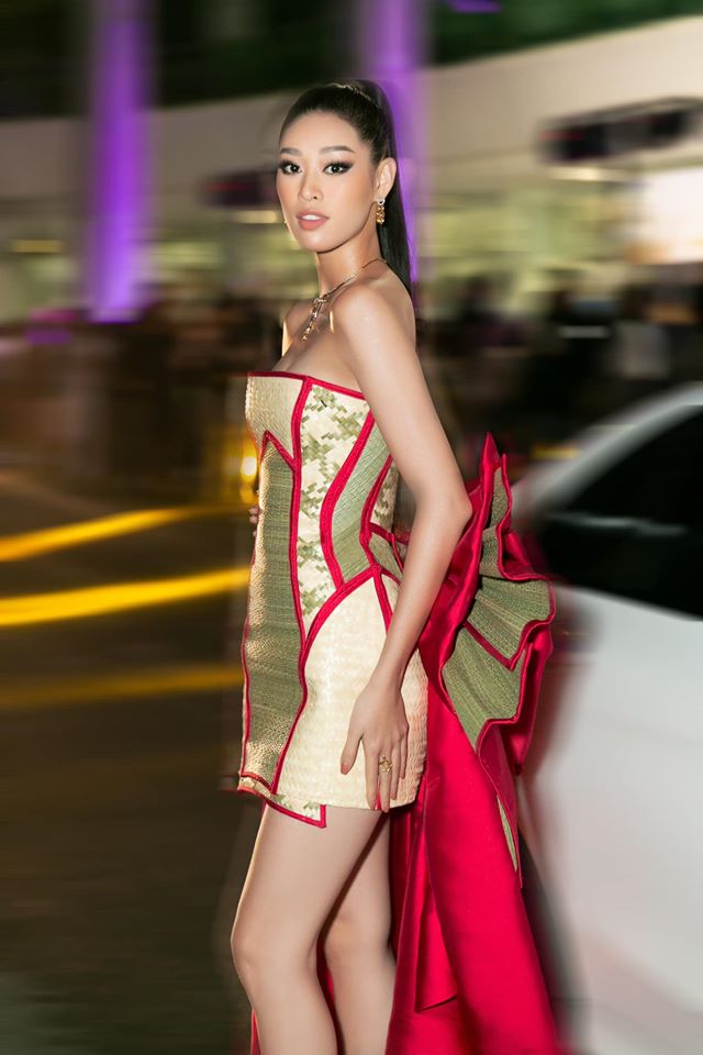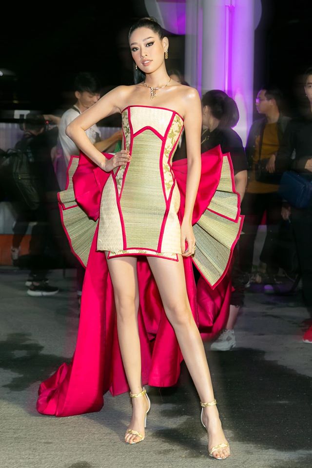 Tối 12/1, tham dự một sự kiện tại TP.HCM, Hoa hậu Hoàn vũ Việt Nam - Khánh Vân đã nhanh chóng thu hút sự chú ý khi thả dáng trong chiếc váy ngắn khoe đôi chân dài thẳng tắp cùng hình thể đáng ngưỡng mộ. Được biết, chất liệu của sáng tạo này được làm từ chiếu cói, do NTK Nguyễn Tiến Truyển cùng stylist Trần Đạt lên ý tưởng.