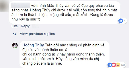 Khi đọc được bình luận này, Hoàng Thùy nhanh chóng đáp lại: “Trên đời này chẳng có phân định vẻ đẹp ác và thánh thiện em à. Chỉ có hành động ác ý hay hành động thánh thiện, văn minh thôi. Hãy sống văn minh dù chị chẳng biết em là ai nhé”. Lời phản pháo của Hoàng Thùy nhận được sự đồng tình, ủng hộ của rất nhiều fan.