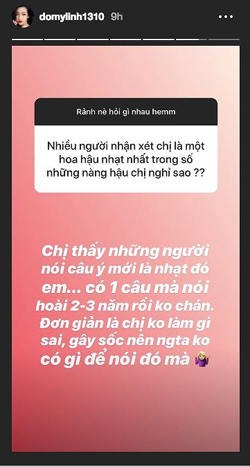 Cụ thể, khi bị một thành viên mạng nhận xét là hoa hậu nhạt nhòa nhất, Mỹ Linh đã có màn đáp trả cực thấm: “Chị thấy những người nói câu đó mới nhạt đó em. Có một câu mà nói hoài 2, 3 năm không chán. Đơn giản là chị không làm gì sai, không gây sốc nên người ta không có gì để nói”