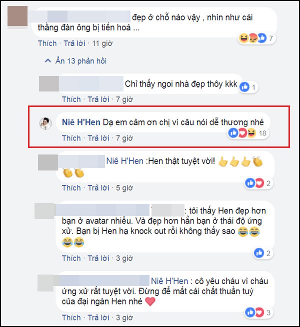 Với vẻ ngoài lệch chuẩn, H'Hen Niê thường xuyên phải đối mặt với những bình luận về nhan sắc không mấy tích cực. Song cách đáp trả lại sự chê bai của H'Hen Niê khiến nhiều người liền có suy nghĩ khác về cai đẹp. Không “đao to, búa lớn” với anti-fan, H'Hen Niê chọn cách xử sự thân thiện, thông minh nhưng cũng không kém phần hài hước.