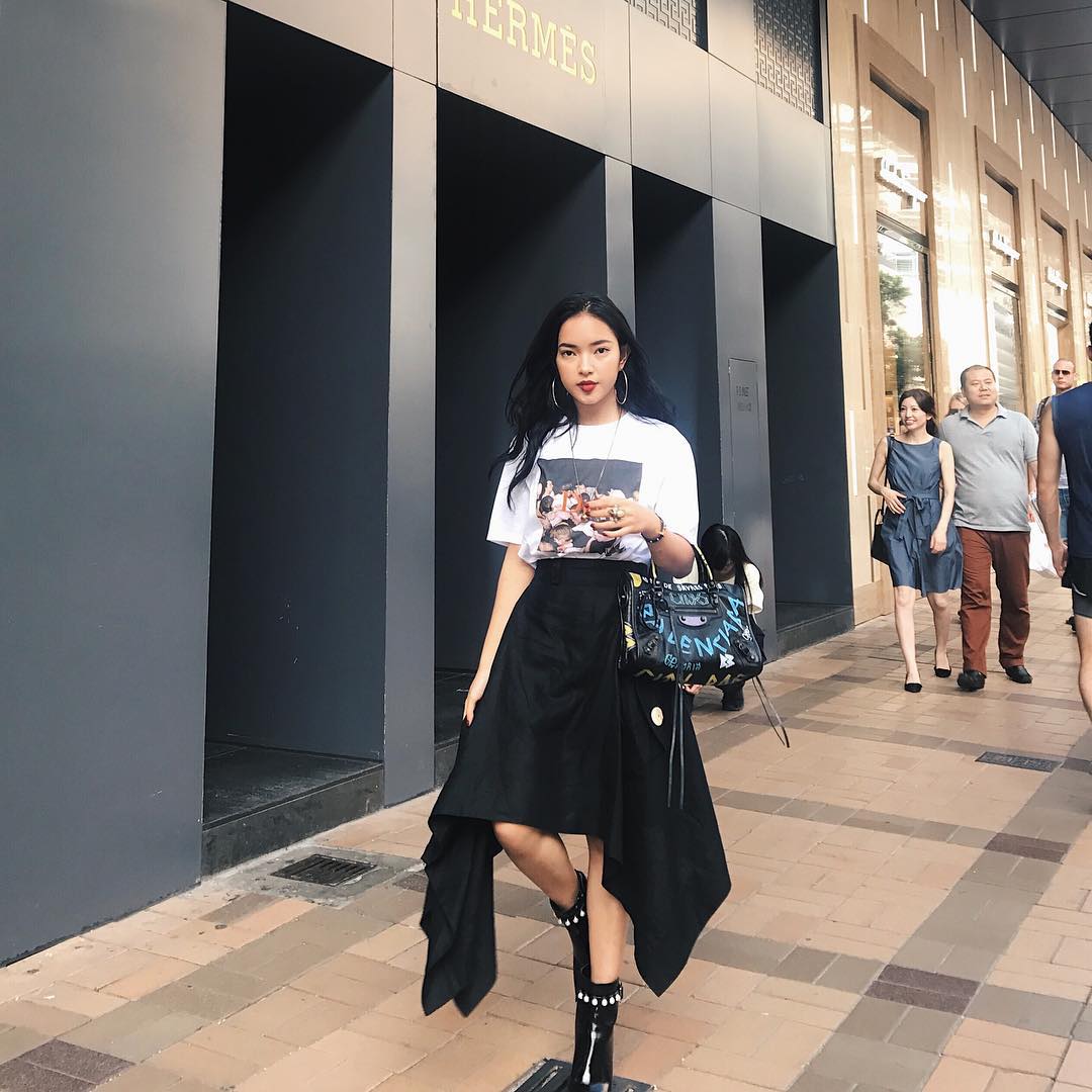 Tham dự show Louis Vuitton tại Hong Kong, Châu Bùi không làm người hâm mộ thất vọng với danh xưng fashionista. Chân váy cấu trúc bất đối xứng đang “làm mưa làm gió” khắp các sàn diễn thời trang phối ăn nhập áo phông họa tiết basic. Boots và túi xách Balenciaga hoàn thiện tổng thể.