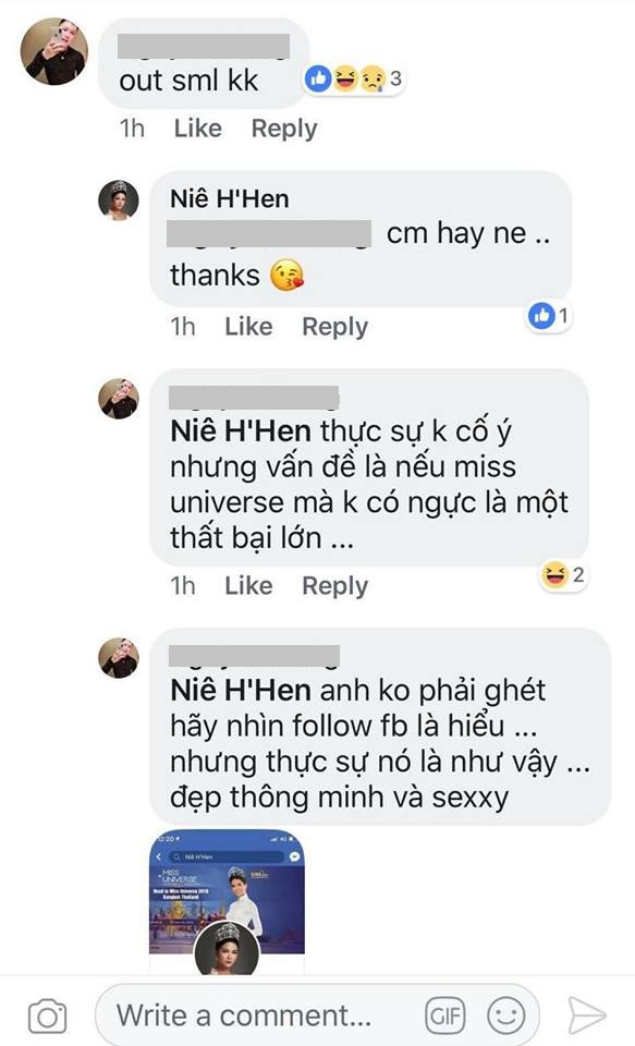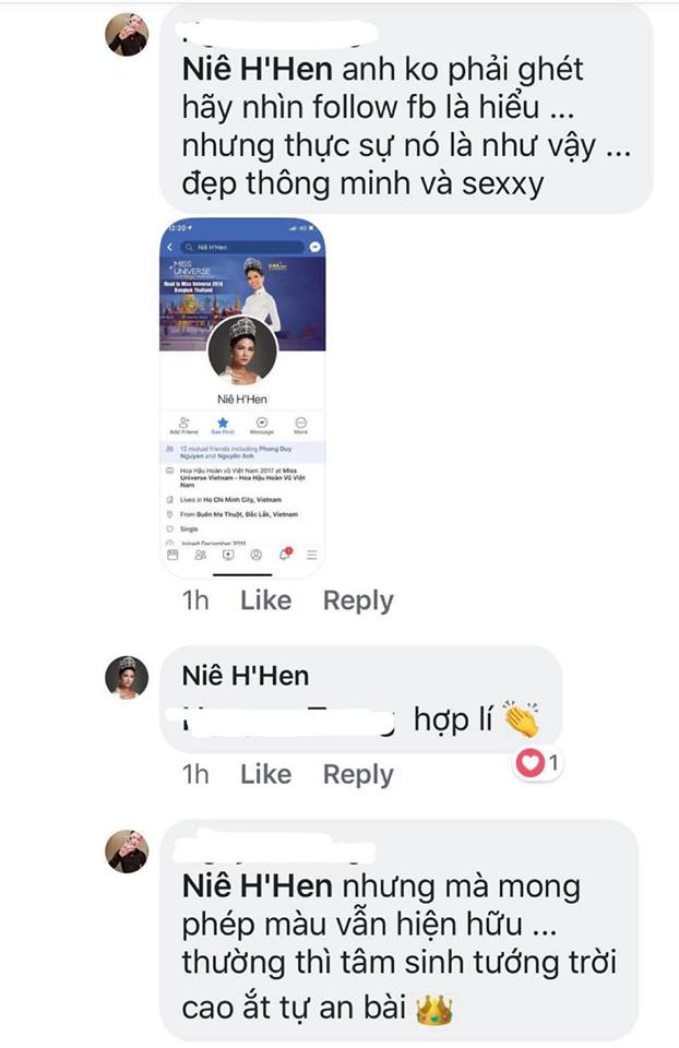 Tuy nhiên cũng như bao người đẹp khác, H'Hen Niê khó lòng tránh khỏi sự soi xét có phần gắt gao đến từ một bộ phận khán giả khó tính. Mới đây nhất, sau khi theo dõi sự thể hiện của chân dài Ê Đê trong những ngày qua, một tài khoản Facebook đã có cách nhìn phiến diện của mình để đánh giá H'Hen Niê. Theo đó tài khoản này khẳng định H'Hen Niê khó lòng có tấm vé vào bán kết của cuộc thi năm nay. Trước sự vùi dập của antifan, những tưởng H'Hen Niê sẽ “xù lông” phản pháo. Song dù đang dày đặc với lịch trình cuộc thi, chân dài Ê Đê vẫn bình sinh, nán chút thời gian đáp trả sự đánh giá thiếu chuẩn xác về mình một cách không thể nào thân thiện hơn.
