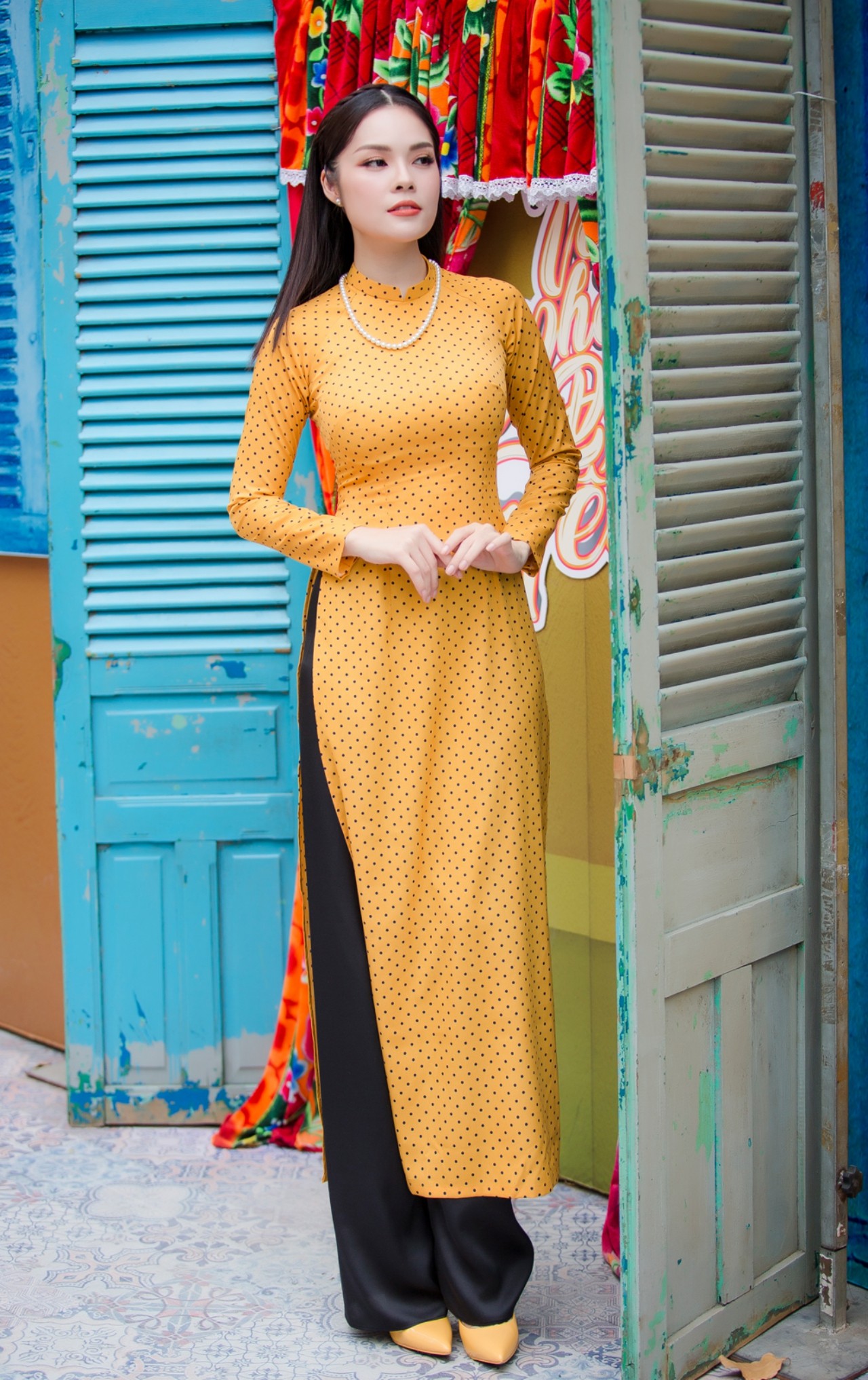 Nàng Á hậu Điện ảnh vẫn chọn Áo dài truyền thống với phom dáng cổ điển, chất liệu đơn giản cùng hoa văn nhẹ nhàng.