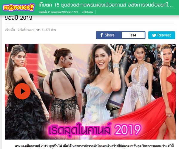 Tờ báo K@Pook!, một trang tin nổi tiếng và uy tín của Thái Lan đăng hình Ngọc Trinh bên cạnh những dàn mỹ nhân thế giới khác trong mục mặc đẹp nhất trên thảm đỏ LHP Cannes 2019