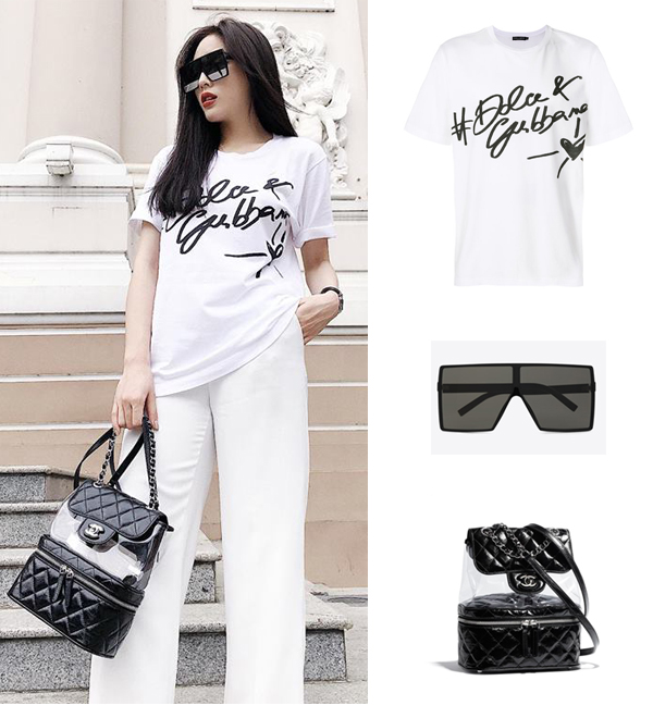 Với bộ outfit tưởng đơn giản chỉ gồm hai màu đen trắng nhường kia, Kỳ Duyên cũng đã kịp trưng chiếc balo Chanel trong suốt lạ mắt có giá gần 80 triệu, chiếc kính mắt hiệu YSL có giá 11 triệu và áo thun nam của Dolce&Gabanna có giá 6 triệu đồng.