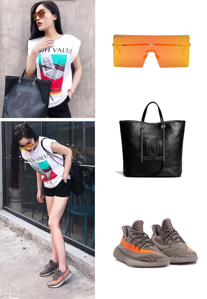 Trong một set đồ màu sắc hơn, Kỳ Duyên sử dụng kính của Dior có giá 11 triệu, chiếc túi Chanel khổ lớn có giá tới 113 triệu đồng, đôi sneaker Yeezy boost 350 có giá cả lên xuống thất thường, lúc đắt nhất có thể lên tới hơn chục triệu đồng.