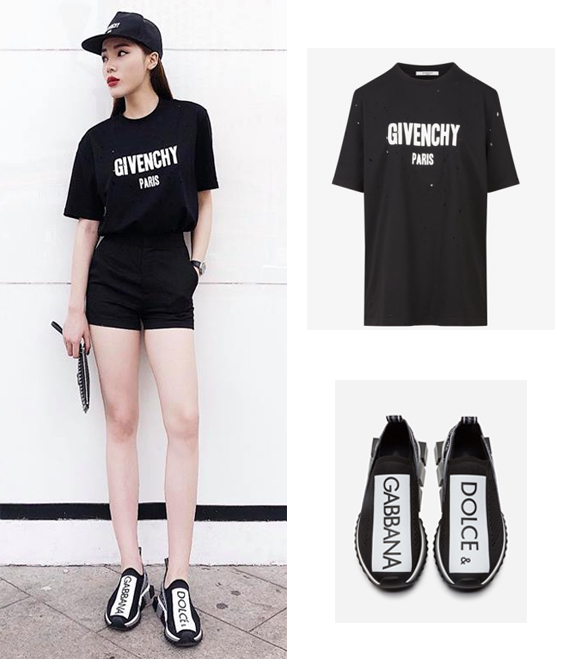 Lại là một set đồ đen trắng nữa của Kỳ Duyên có giá không hề đơn giản: áo thun đen 17 triệu, đôi sneaker Dolce&Gabbana 17 triệu đồng.