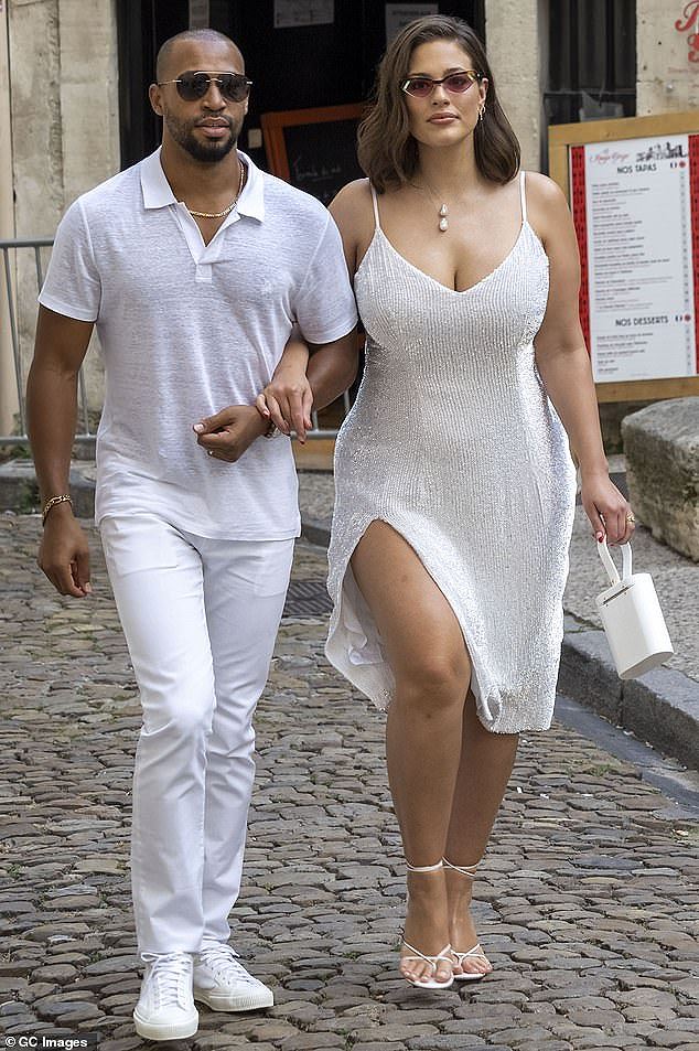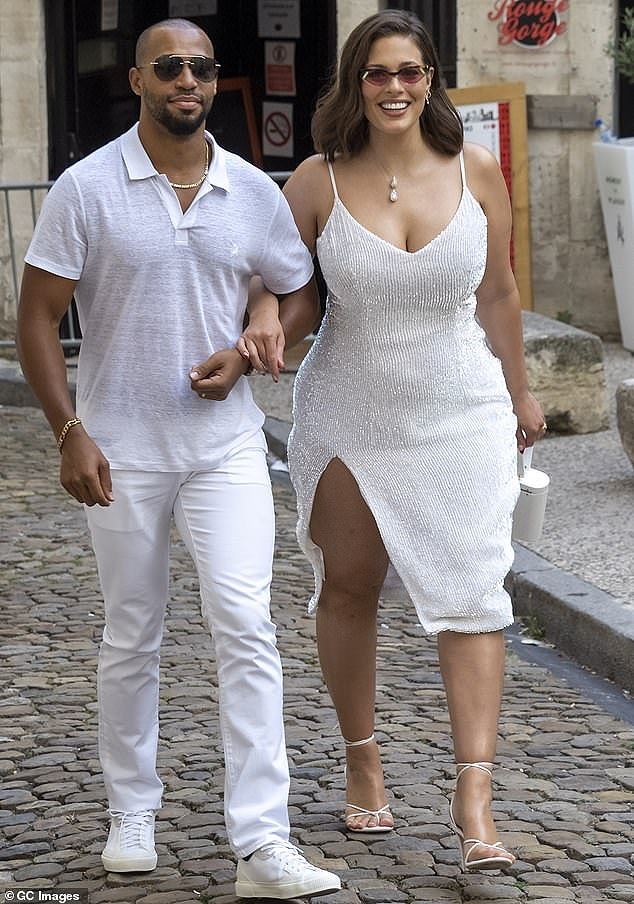 Người mẫu plus -size Ashley Graham gợi cảm với đầm hai dây dự tiệc cưới cùng chồng