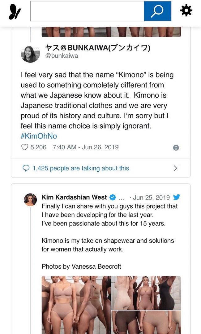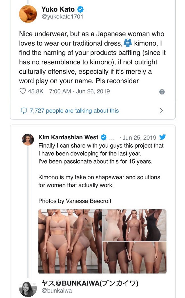 Rất nhiều comments của người Nhật trong bài post của Kim ” “Đồ lót đẹp thât, nhưng là một phụ nữ Nhật Bản thích mặc trang phục truyền thống Kimono. Chúng tôi thấy việc đặt tên cho các sản phẩm của bạn trở nên khó hiểu (vì nó không giống với kimono), nếu không hoàn toàn phản cảm về mặt văn hóa, đặc biệt nếu đó chỉ là một trò chơi chữ dưới tên Kim của bạn. Xin cô hãy cân nhắc lại trong việc đặt tên.”