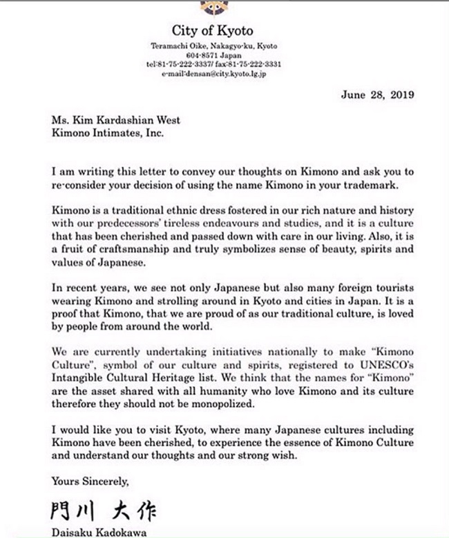 Bức thư của ngài thị trưởng Nhật Bản gửi đến Kim trong việc gỡ bỏ cái tên Kimono ra khỏi dòng sản phẩm của cô