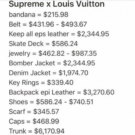 Theo đó, mức giá niêm yết cho 1 tuần bán lẻ các sản phẩm của Supreme có giá rất “hữu nghị” và rẻ hơn so với các sản phẩm của Supreme x Louis Vuitton rất nhiều.