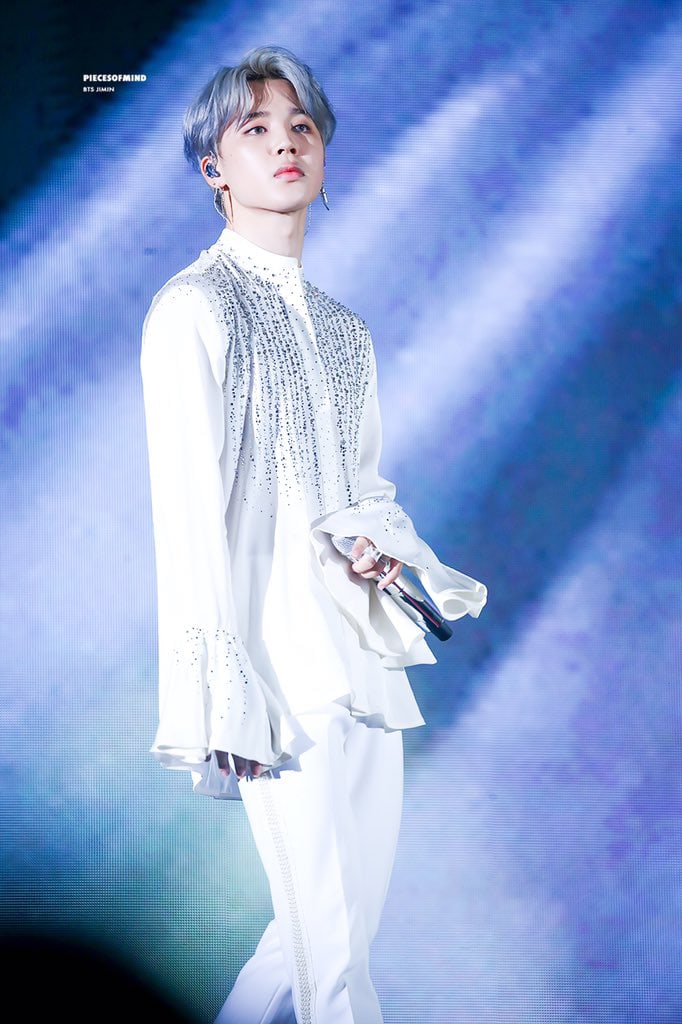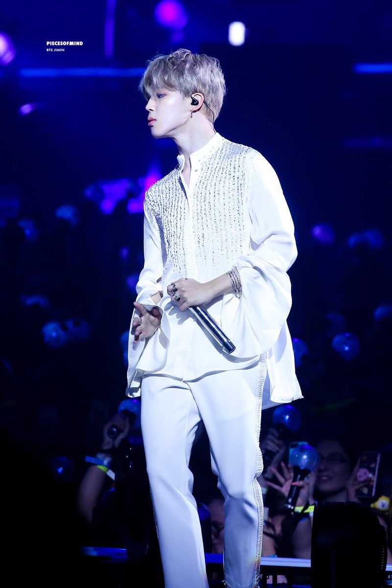 Với những dải kim tuyến được phủ trên phần vai trở xuống cùng phần cổ tay được thiết kế tinh xảo, thật không ngoa khi nói rằng Jimin trông vô cùng xinh đẹp và chả khác gì một thiên thần khi diện bộ trang phục trắng dưới này.
