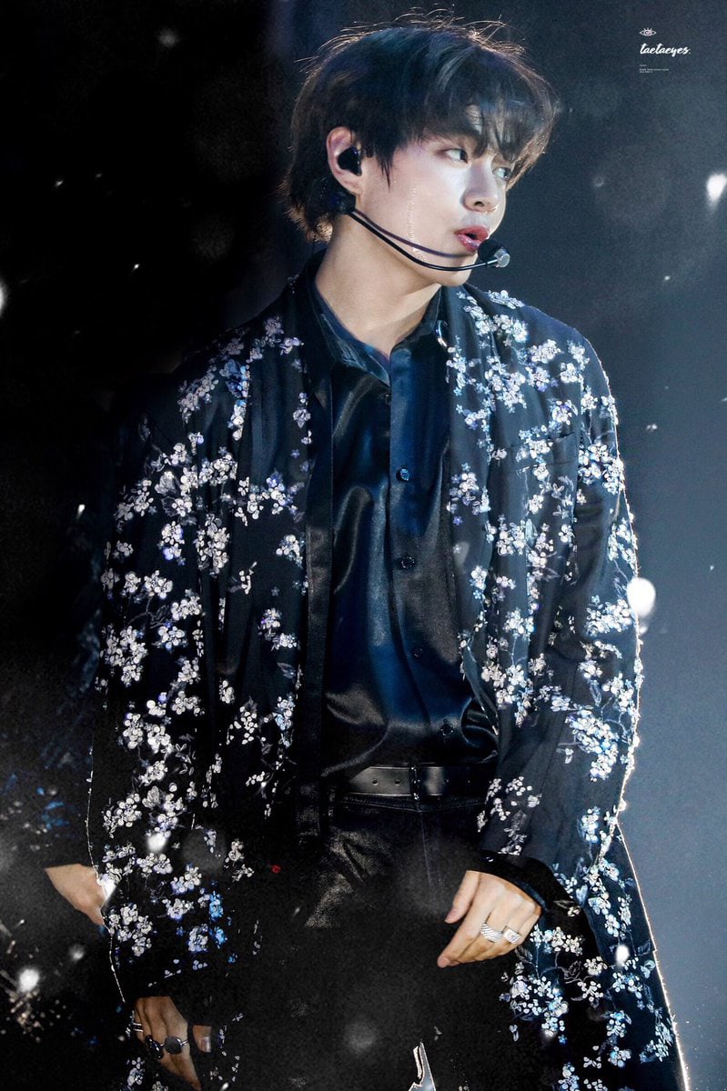 V (BTS) và áo choàng hoa chính là sự kết hợp hoàn hảo. Áo khoác thiết kế lấy cảm hứng từ pajama cùng với những họa tiết hoa như được thêu vào áo làm cho V trông giống như một tác phẩm nghệ thuật.