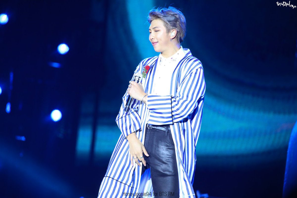 Không 'ma mị' cũng không 'lả lướt' như các thành viên khác, RM mang đến phong cách năng động và tươi mới với áo khoác dáng dài kẻ sọc xanh dương kết hợp quần jeans và sơ mi trắng.