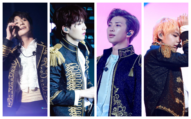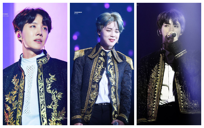 Xuất hiện trong những chiếc vest đen với phong cách như 'hoàng gia' phương Tây thời xưa cùng những họa tiết được thiết kế tỉ mỉ trên nền vài đen lấp lánh. Các thành viên BTS trông vô cùng điển trai và chả khác nào những chàng hoàng tử trong mơ mà bất cứ cô gái nào cũng ao ước.