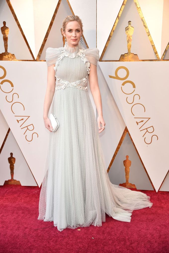 Emily Blunt chọn thiết kế màu pastel nữ tính với điểm nhấn nằm ở phần cầu vai. Trang phục của cô thuộc BST Haute Couture xuân 2018 của nhà mốt Schiaparelli.