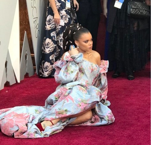 Andra Day gây 'náo loạn' thảm đỏ năm nay khi không ngần ngại nằm bệt xuống thảm đỏ để tạo dáng trong thiết kế từ nhà mốt Zac Posen.