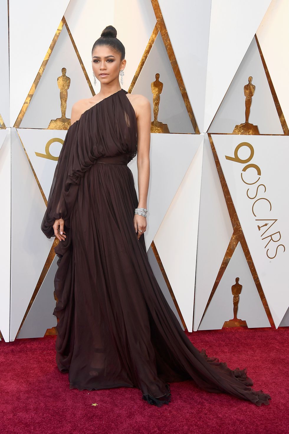 Đây là lần đầu tiên có sự góp mặt của sắc nâu trên thảm đỏ. Chiếc đầm xếp ly hoành tráng của Zendaya đã thay đổi hoàn toàn thông lệ trước đó. Chiếc váy không đụng hàng từ nhà mốt Giambattista Valli đã thổi làn gió mới lên nền thảm đỏ cho giải Oscar năm nay.