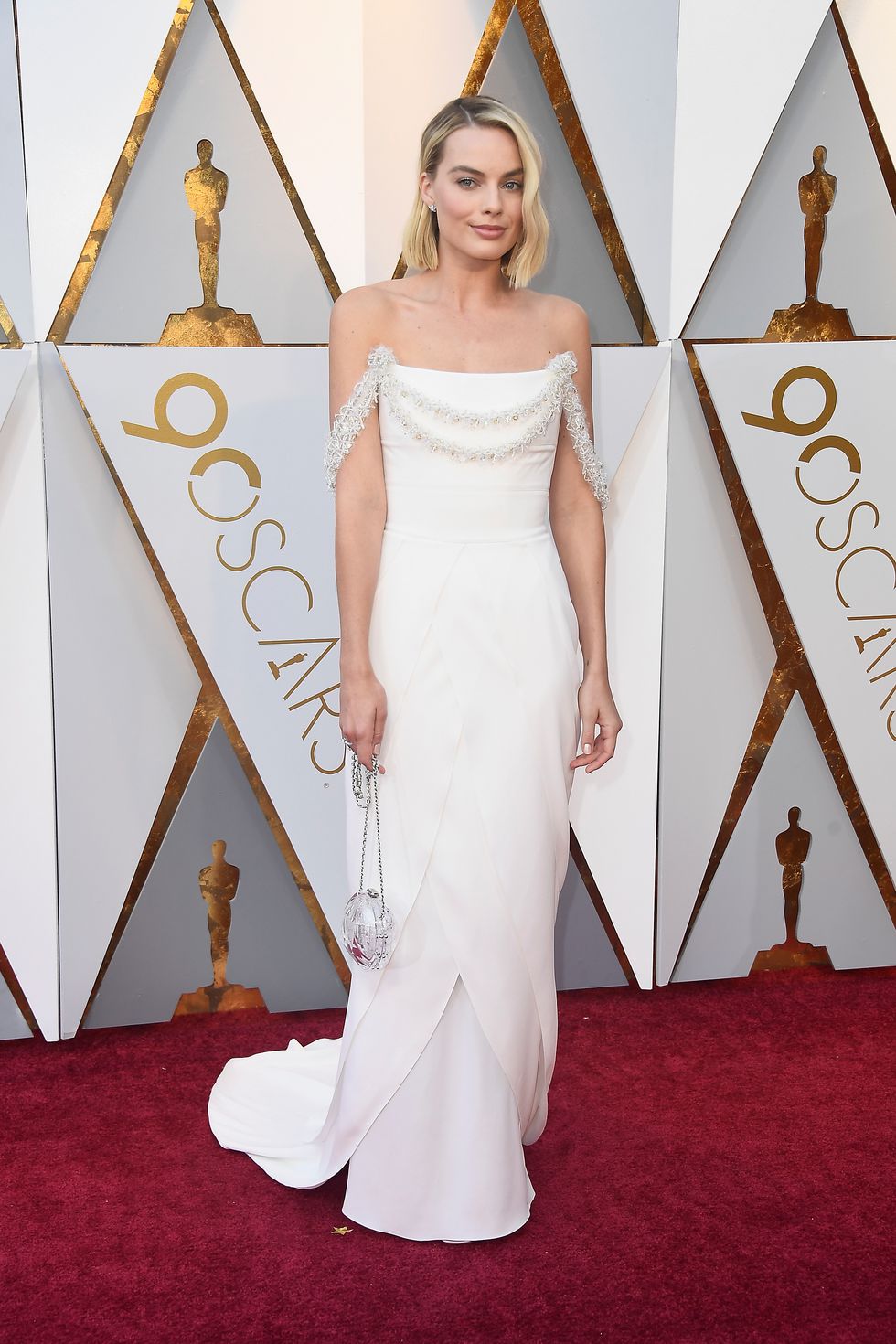 Margot Robbie xuất hiện dịu dàng trong thiết kế tao nhã từ mốt Chanel. Chiếc vòng ren trễ vai làm nổi bật đôi vai trần quyến rũ.