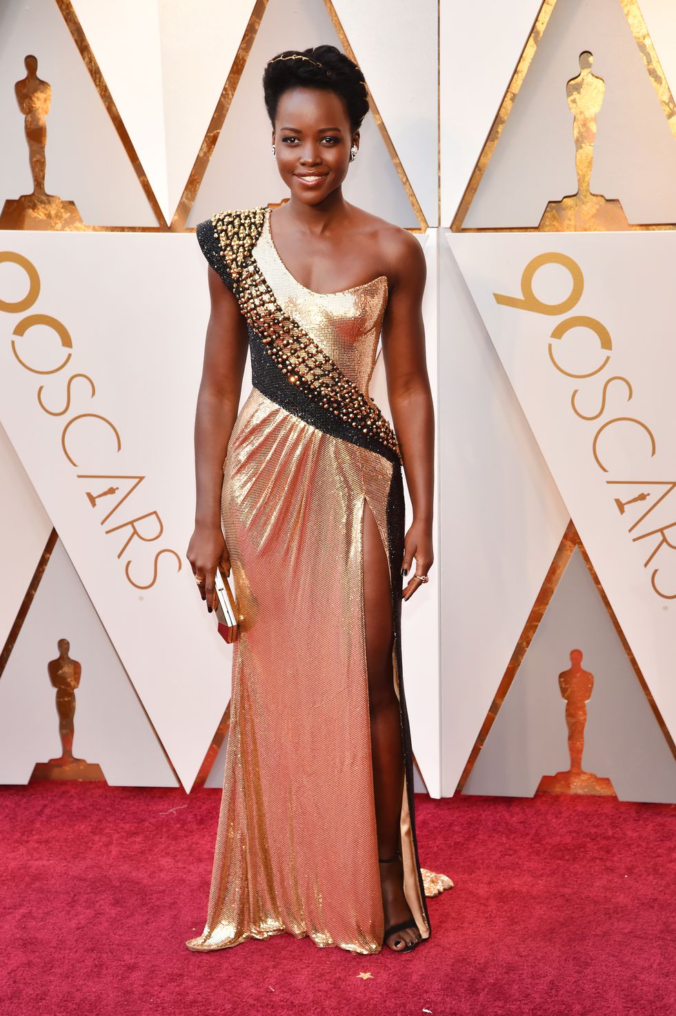 Đảm vai diễn quan trọng trong phim “Black Panther”, không khó nhận ra trong Nyong trong bộ Custom Atelier Versace.