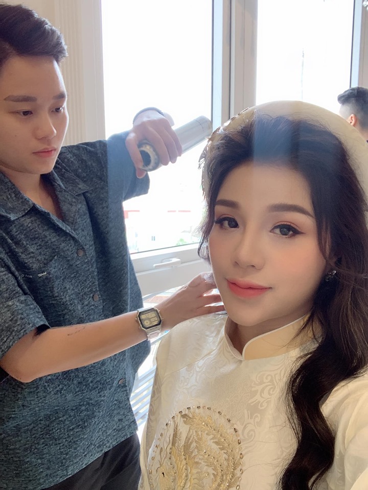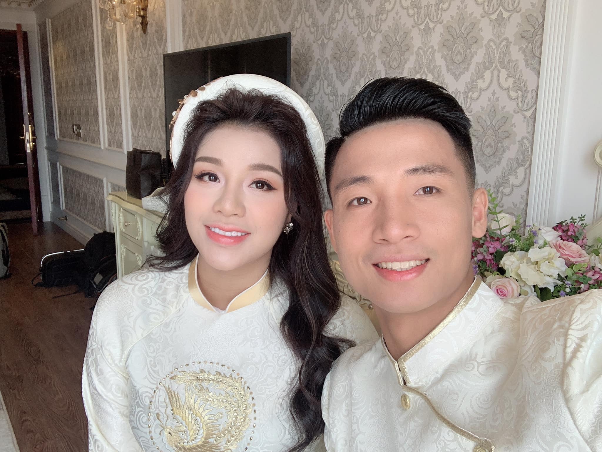 Bùi Tiến Dũng cũng được trang điểm rất nhẹ, chải tóc bồng gọn gàng khi sánh vai cùng cô dâu.