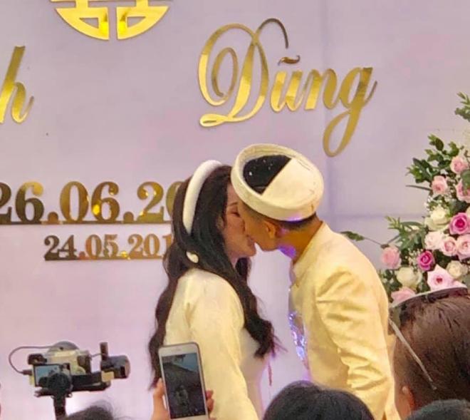 Trong ngày quan trọng, cả hai cùng diện áo dài màu vàng sáng thuần chất Việt, đồng thời trao nhau nụ hôn hạnh phúc giữa những tràng pháo tay của khách mời cùng gia đình.
