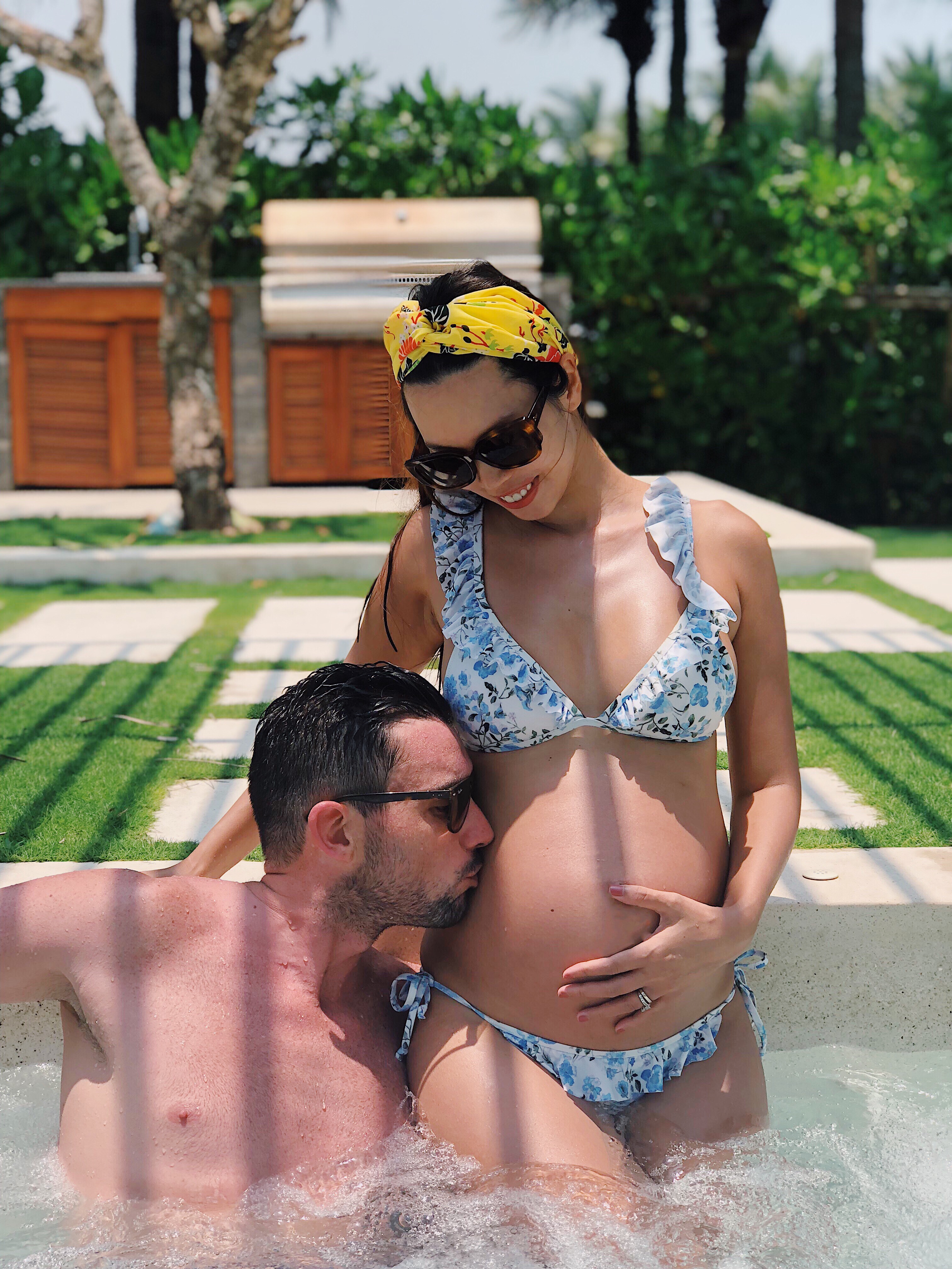 Diện bikini in hoa nhí trẻ trung, siêu mẫu vàng của làng thời trang Việt tự tin thả dáng, khoe chiếc bụng bầu xinh xinh.