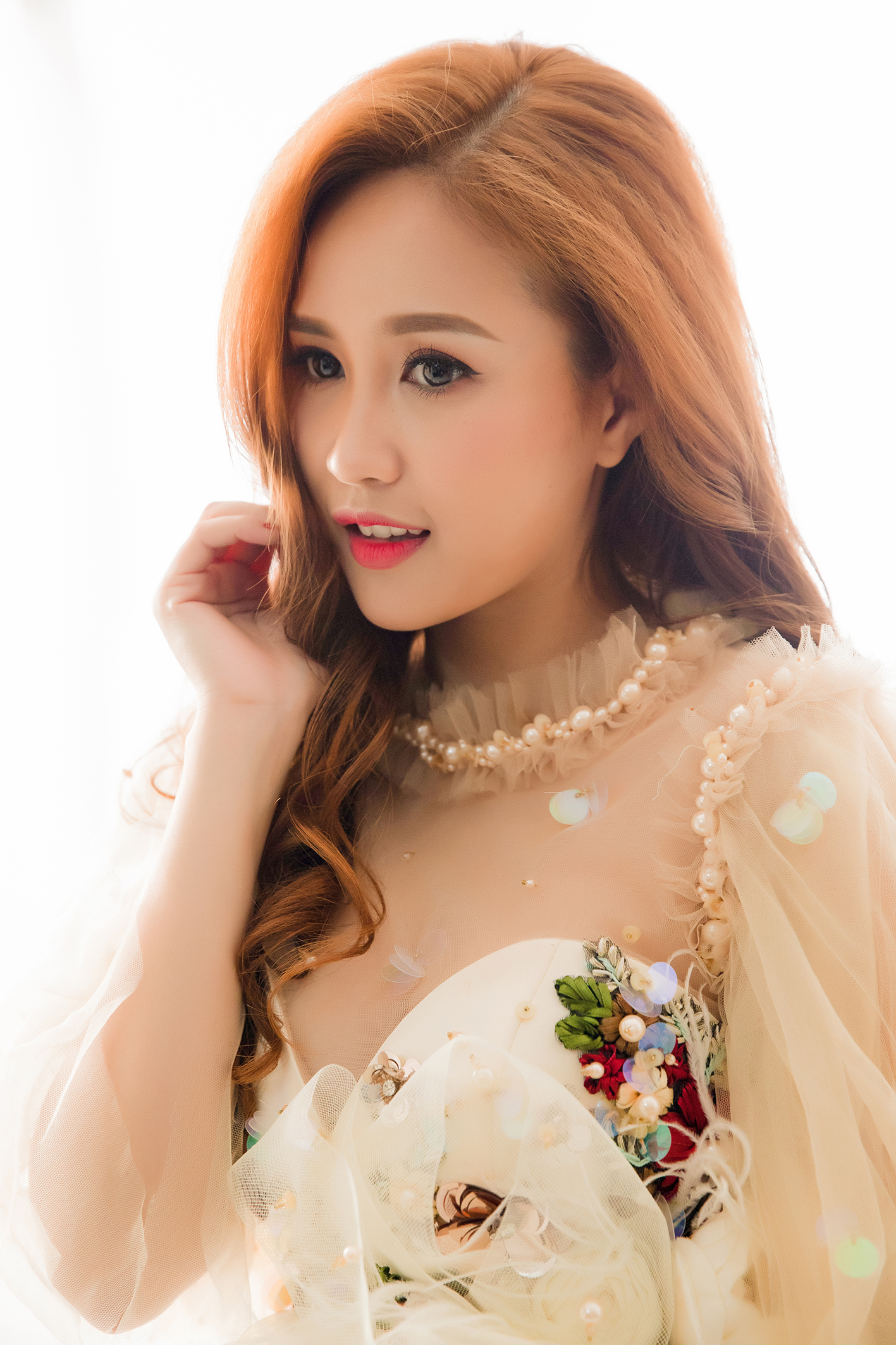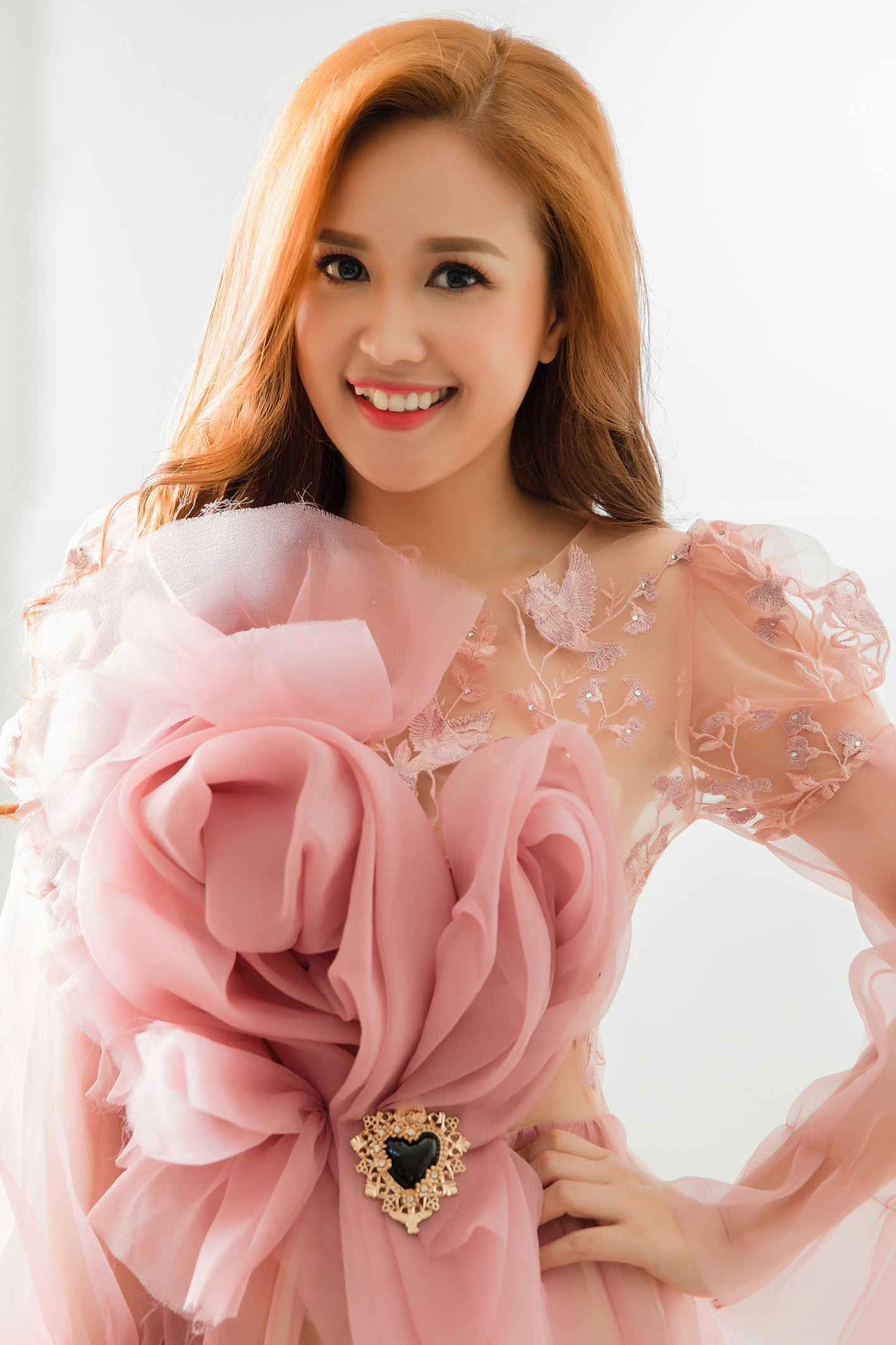 Với gương mặt trẻ trung, người đẹp ưu ái chọn những thiết kế với tông màu nhạt, đính kết hoa nổi uốn cầu kỳ.
