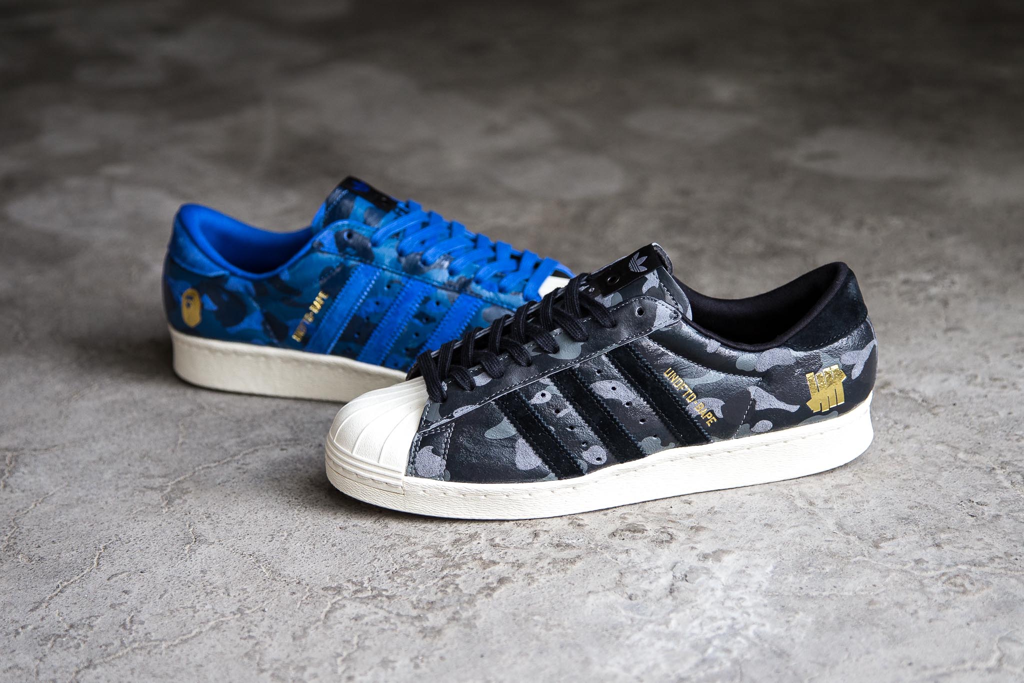 BAPE x UNDFTD x adidas Superstar 80s phối màu Blue Camo và Black Camo.
