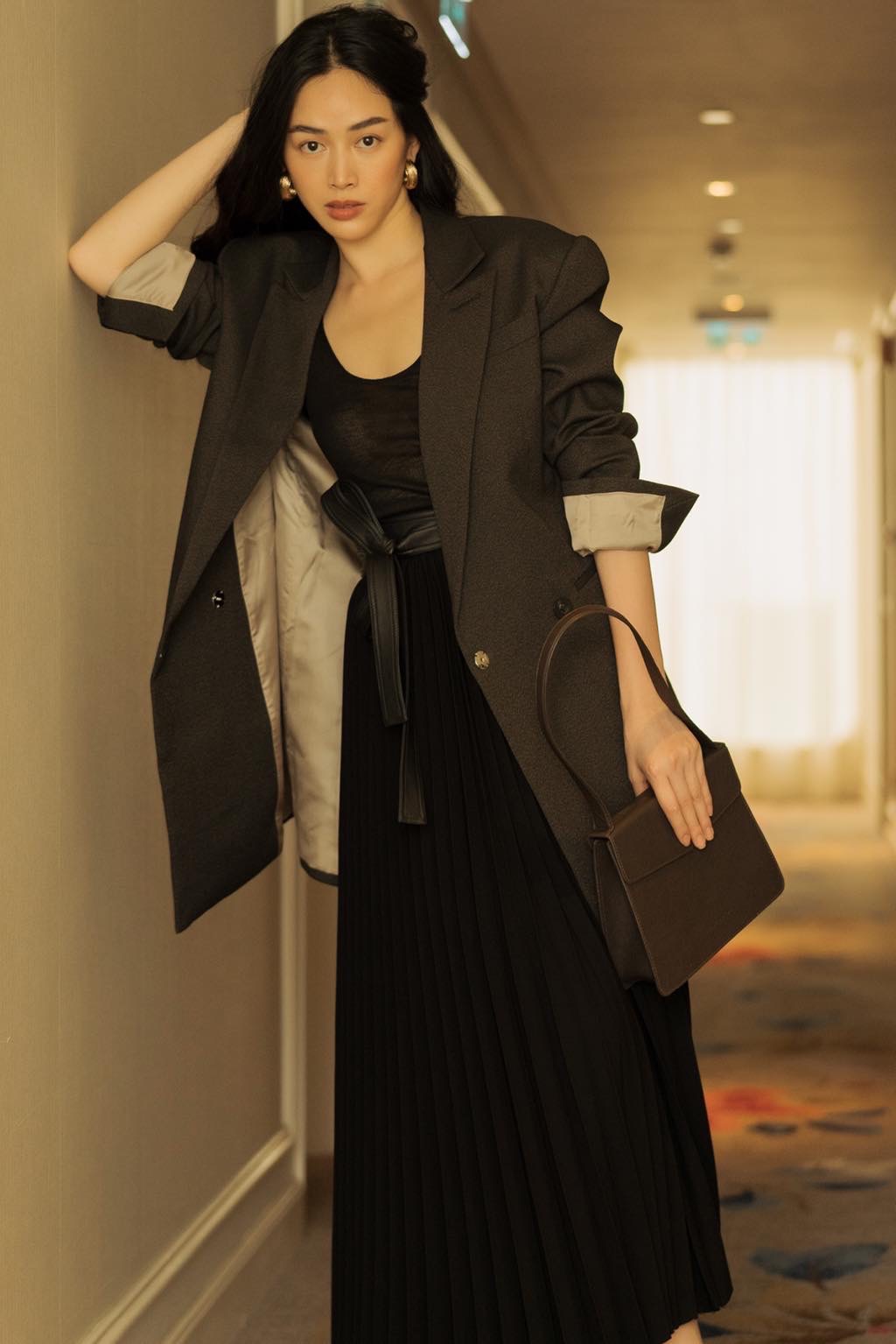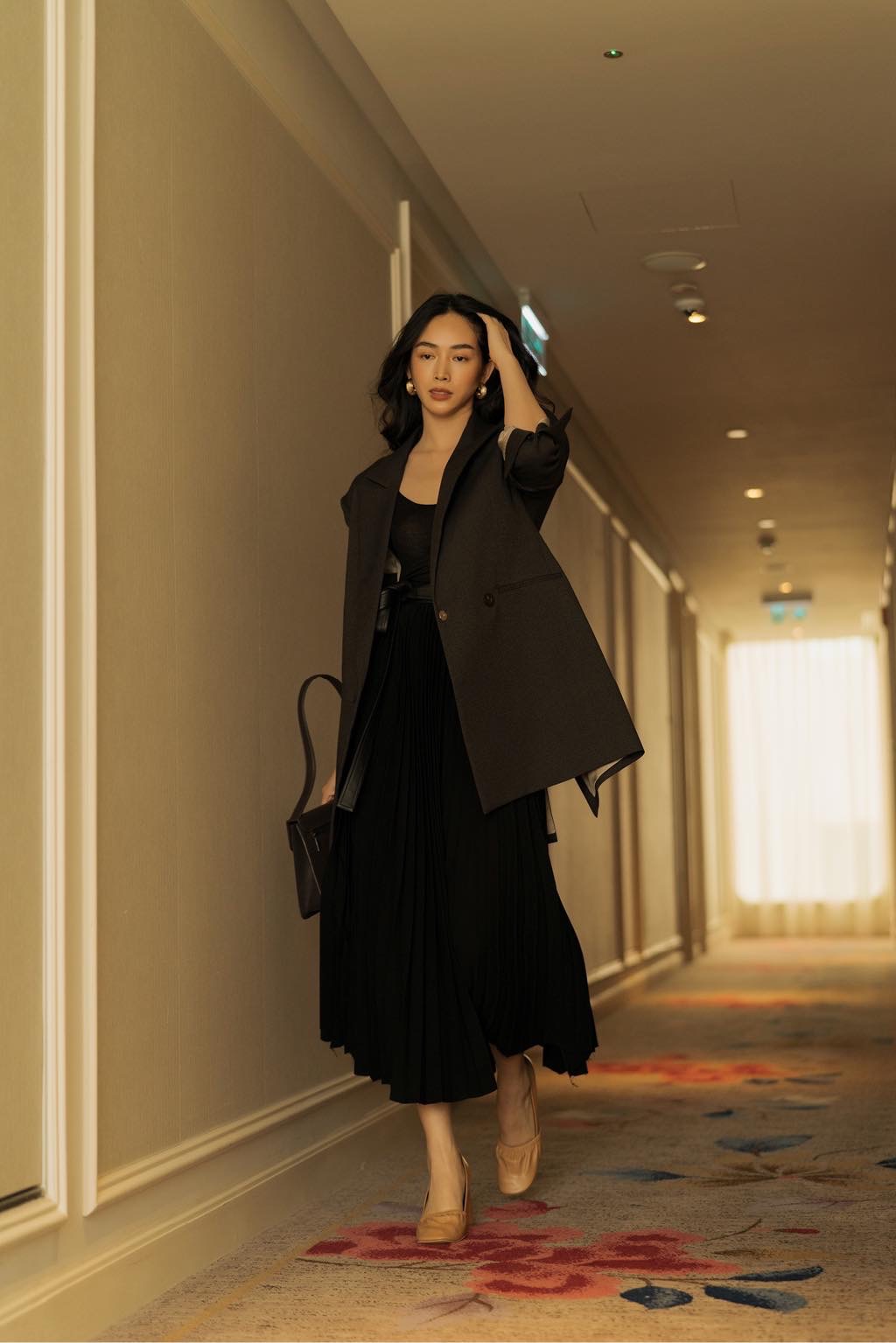 Còn gì lịch sự và sang chảnh hơn khi tới công sở với set đồ này. Chân váy midi và áo khoác dài màu đen được mix nhịp nhàng với áo thun màu be nhã nhặn
