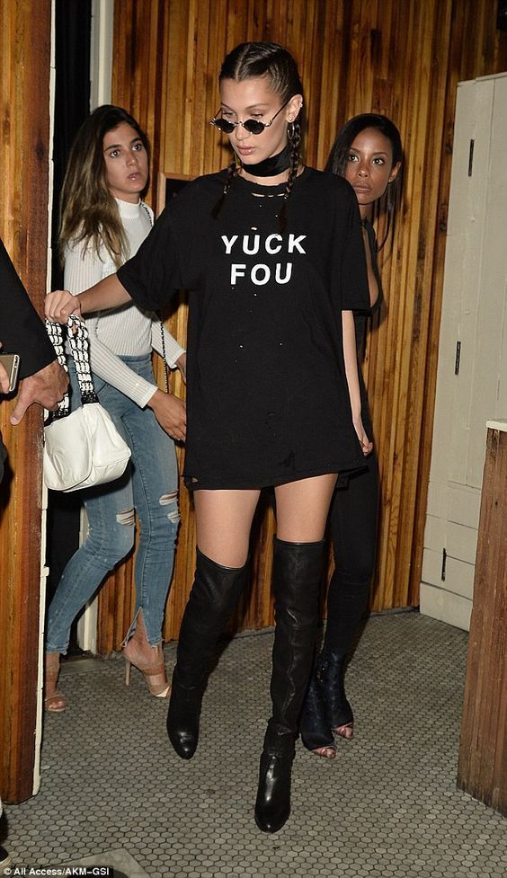 Chân dài Bella Hadid sành điệu với áo thun đen slogan “chất chơi” mix cùng boots cổ cao kho đến 1 bữa tiệc
