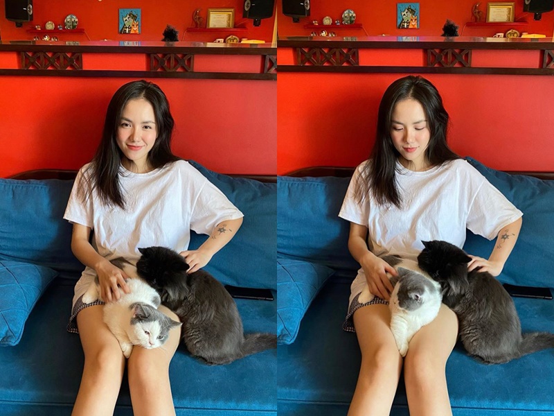 Ca sĩ Phương Ly chọn quần short, áo thun rộng để mặc ở nhà mùa dịch. Set đồ này giúp cô trẻ trung, thoải mái và xinh đẹp.
