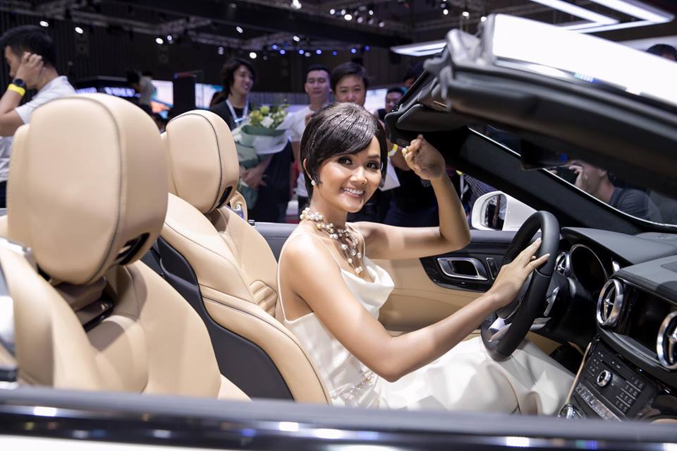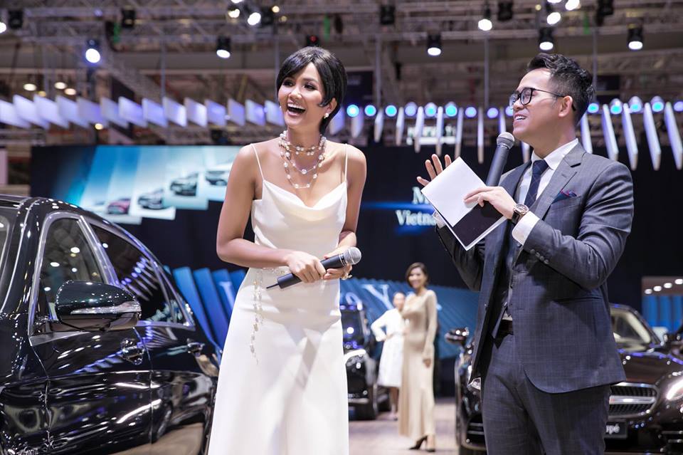 Xuất hiện trong sự kiện triển lãm ô tô gần đây, nàng hậu gốc Ê-đê khoe dáng mảnh khảnh khi diện đầm hai dây ôm sát cơ thể. Cô mix trang phục cùng giày cao gót và trang sức ngọc trai. Nhưng chính mái tóc giả là “thủ phạm” khiến người đẹp mất điểm nghiêm trọng.
