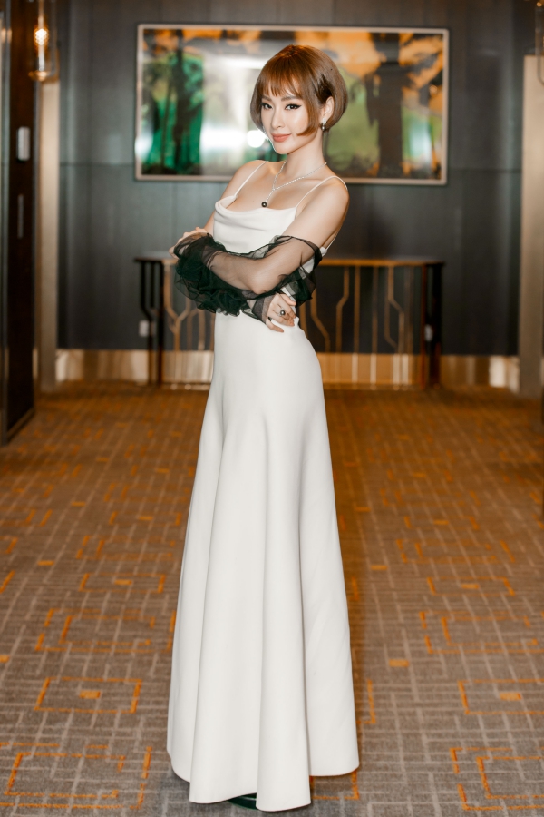 Chiếc váy hai dây thanh lịch tôn sắc vóc và làn da của Angela Phương Trinh. Phần ren choàng cổ tay trở thành điểm nhấn, tạo thành tổng thể mang màu sắc cổ điển.