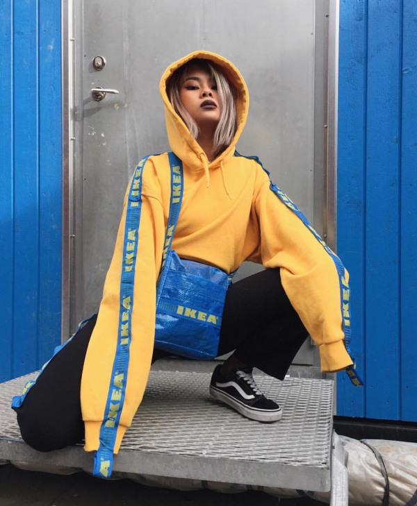 Sáng tạo chiếc hoodie vàng với sợi dây dù đính ngay phần tay áo thấp thoáng thiết kế của Vetements x Champion, có điều đây là sản phẩm lấy cảm hứng từ thương hiệu IKEA. Không chỉ áo mà cả túi đeo chéo cũng được tín đồ này đem lên bộ outfit của mình.