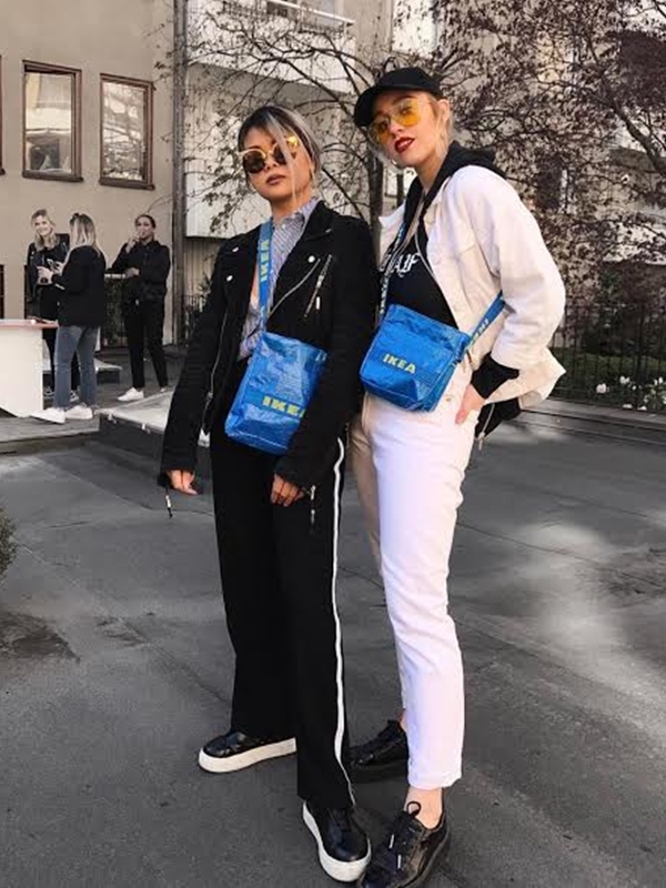 Hai tay chơi thực thụ chào sân bằng phong cách minimalism, có điều chiếc túi IKEA xanh nổi bật chính là điểm nhấn thú vị cho cả hai bộ outfit.