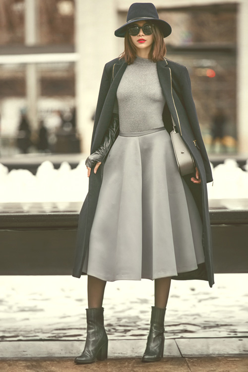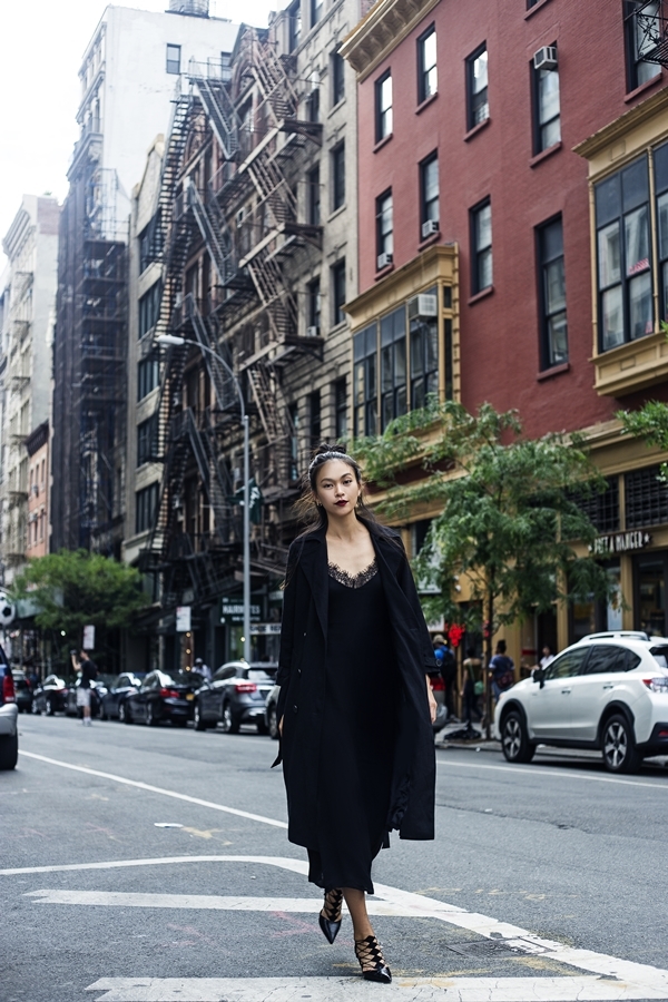 Hay sang trọng với áo măng tô dáng dài đi cùng váy ngủ ren slip dress trên đường phố New York.