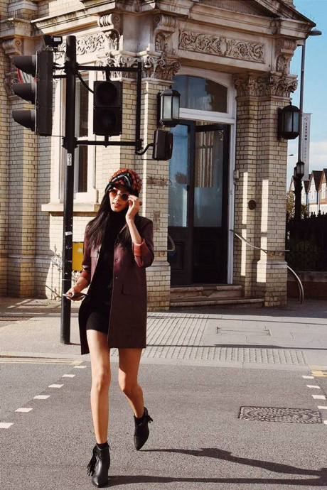 Cùng ưa chuộng sắc đen, nhưng cách phối của Hoàng Thùy lại đậm nét, cá tính, thời thượng. Đơn cử như như outfit váy ôm cùng vest dạ khoác ngoài. Không thể không kể đến điểm nhấn của cả bộ trang phục là chiếc nón mang màu sắc nổi bật.