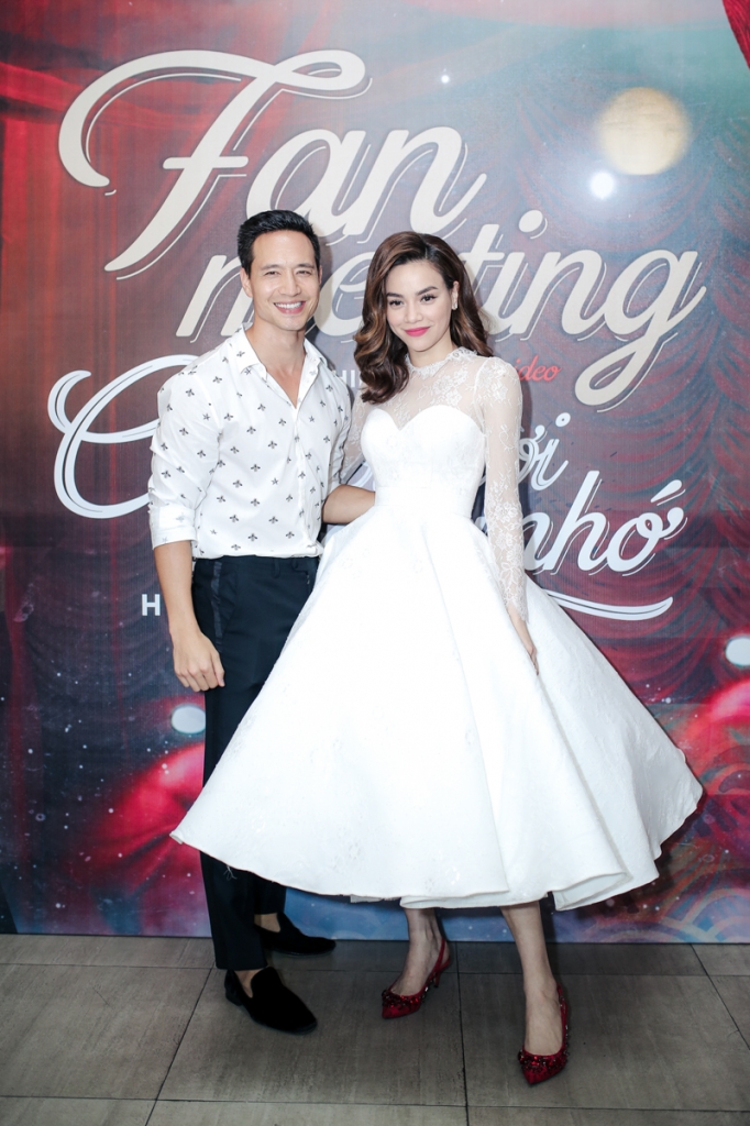 Hồ Ngọc Hà hóa thân công chúa kiều diễm với dáng váy bồng, cúp ngực trái tim tông màu trắng. Kiểu tóc xoăn rẽ sóng một bên cũng giúp hình ảnh cô trở nên duyên dáng khi cùng Kim Lý đi sự kiện.