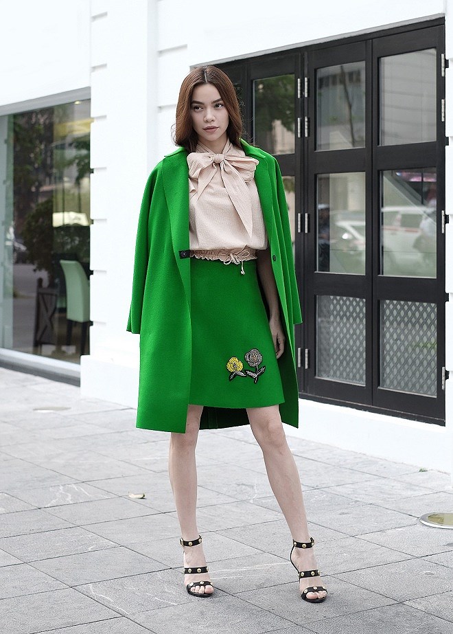 Nữ giám khảo The Face 2016 khiến nhiều khán giả yêu thích với gout streetstyle toàn đồ hiệu. Đơn cử như bộ trang phục áo nơ lụa, kèm chân váy và áo khoác dạ tông xanh đến từ nhà mốt Gucci.